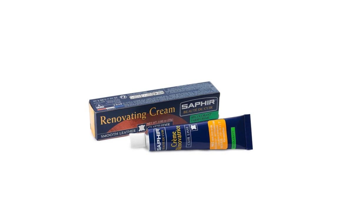 Crème Rénovatrice herstelt de nerf van leer met behulp van herstellende, herkleurende en vernieuwende pigmenten op harsbasis bij krassen, scheuren, brandgaatjes van sigaretten, verkleuringen en slijtage.