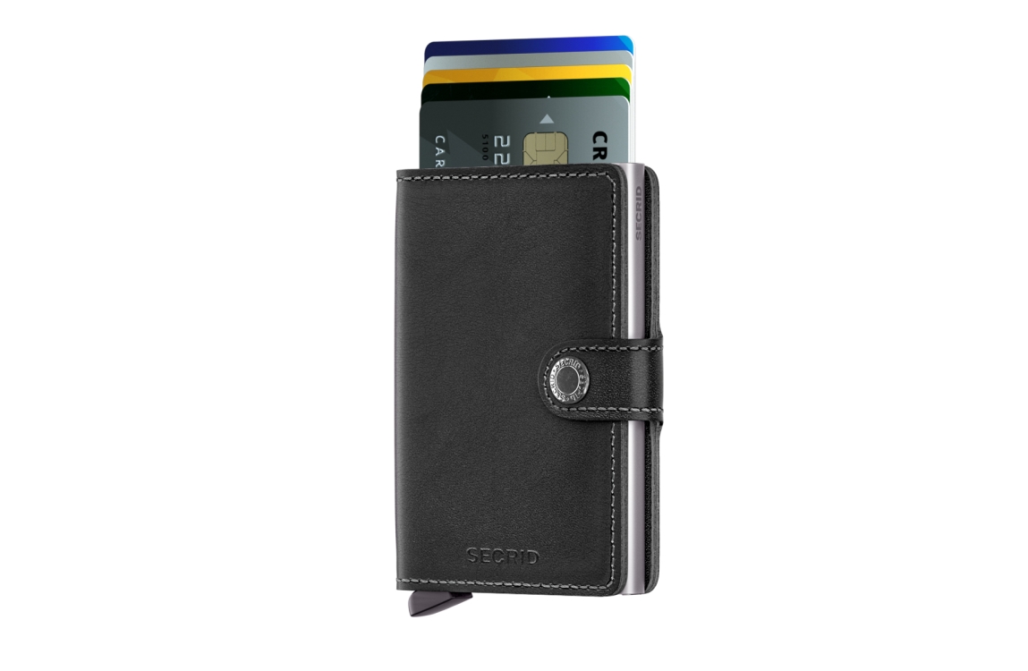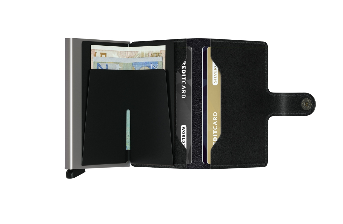Klein van formaat en verrassend groot in opslagcapaciteit. De Miniwallet combineert het beste van twee werelden. De omhulsel bevat bankbiljetten, bonnetjes en kaarten, terwijl de aluminium Cardprotector het mogelijk maakt om kaarten met één simpele beweging uit te schuiven en ze te beschermen tegen buigen, breken en ongewenste draadloze communicatie (RFID-safe).