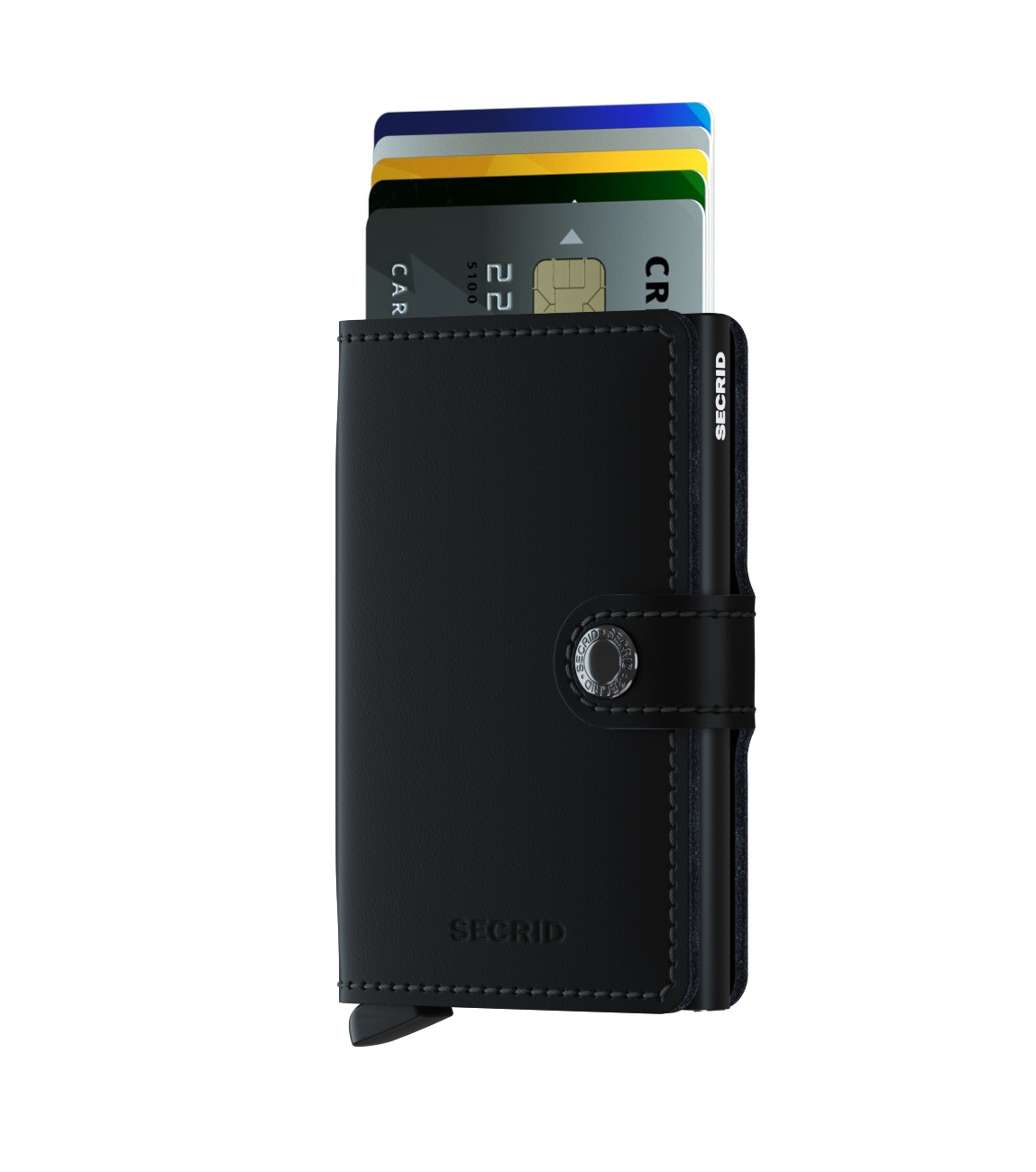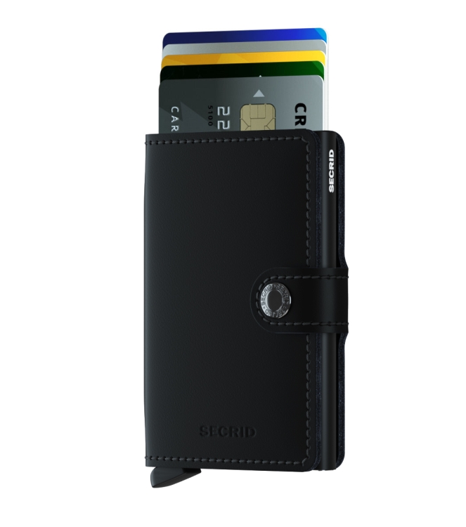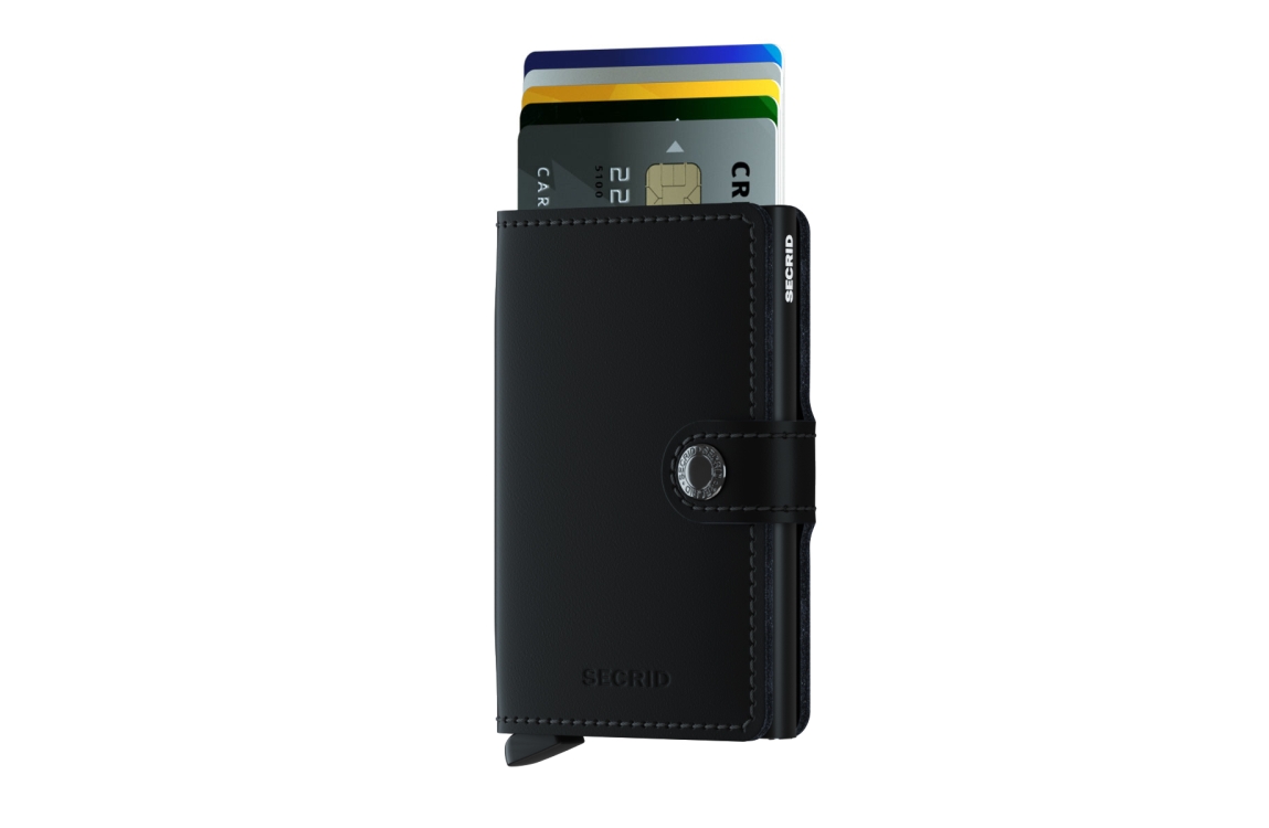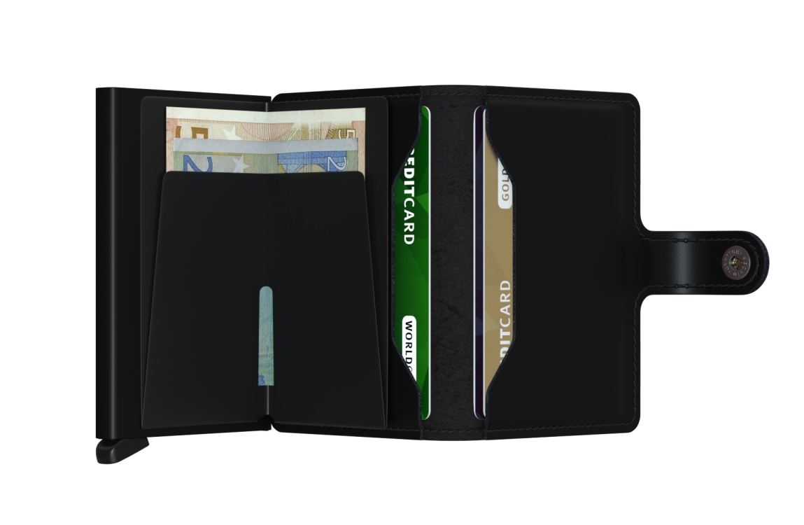Klein van formaat en verrassend groot in opslagcapaciteit. De Miniwallet combineert het beste van twee werelden. De omhulsel bevat bankbiljetten, bonnetjes en kaarten, terwijl de aluminium Cardprotector het mogelijk maakt om kaarten met één simpele beweging uit te schuiven en ze te beschermen tegen buigen, breken en ongewenste draadloze communicatie (RFID-safe).